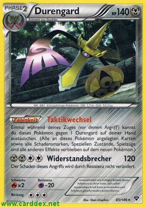 Einmal während deines Zuges (vor deinem Angriff), kannst du dieses Pokémon gegen 1 Durengard auf deiner Hand austauschen. (Alle an dieses Pokémon angelegten Karten sowie alle Schadensmarken, Speziellen Zustände, Spielzüge und alle anderen Effekte verbleiben auf dem neuen Pokémon.)