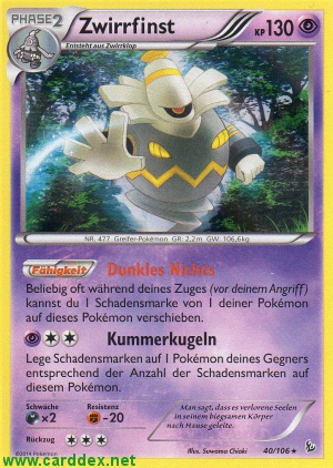 Beliebig oft während deines Zuges (vor deinem Angriff) kannst du 1 Schadensmarke von 1 deiner Pokémon auf dieses Pokémon verschieben.