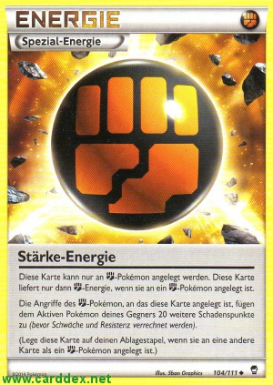 Diese Karte kann nur an -Pokémon angelegt werden. Diese Karte liefert nur dann -Energie, wenn sie an ein -Pokémon angelegt ist. Die Angriffe des -Pokémon, an das diese Karte angelegt ist, fügen dem Aktiven Pokémon deines Gegners 20 weitere Schadenspunkte zu (bevor Schwäche und Resistenz verrechnet werden). (Lege diese Karte auf deinen Ablagestapel, wenn sie an eine andere Karte als ein -Pokémon angelegt ist.)