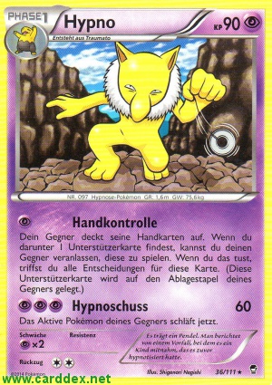 Dein Gegner deckt seine Handkarten auf. Wenn du darunter 1 Unterstützerkarte findest, kannst du deinen Gegner veranlassen, diese zu spielen. Wenn du das tust, triffst du alle Entscheidungen für diese Karet. (Diese Unterstützerkarte wird auf den Ablagestapel deines Gegners gelegt.)