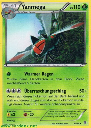 Kosten: Wenn sich dieses Pokémon auf der Bank befand und während dieses Zuges zum Aktiven Pokémon wurde, fügt dieser Angriff 50 weitere Schadenspunkte zu.  Schaden: