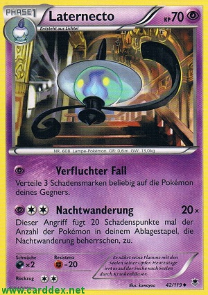 Kosten: Dieser Angriff fügt 20 Schadenspunkte mal der Anzahl der Pokémon in deinem Ablagestapel, die Nachtwanderung beherrschen, zu.  Schaden: