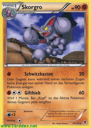 Kosten: Wirf eine Münze. Bei „Kopf“ ist das Aktive Pokémon deines Gegners jetzt vergiftet.  Schaden: