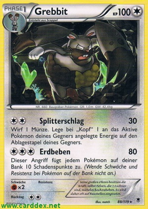 Kosten: Wirf 1 Münze. Lege bei „Kopf“ 1 an das Aktive Pokémon deines Gegners angelegte Energie auf den Ablagestapel deines Gegners.  Schaden: