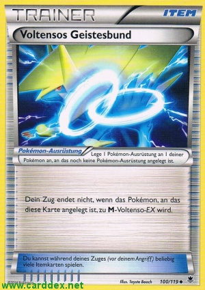 Dein Zug endet nicht, wenn das Pokémon, an das diese Karte angelegt ist, zu M-Voltenso-EX wird.