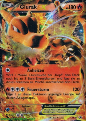 Kosten: Wirf 1 Münze. Durchsuche bei „Kopf“ dein Deck nach bis zu 3 Basis-Energiekarten und lege sie an dieses Pokémon an. Mische anschließend dein Deck.  Schaden: