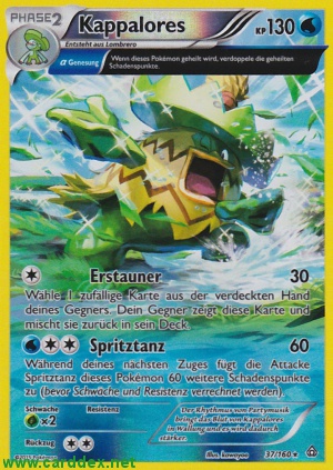 Kosten: Während deines nächsten Zuges fügt die Attacke Spritztanz dieses Pokémon 60 weitere Schadenspunkte zu (bevor Schwäche und Resistenz verrechnet weren).   Schaden: