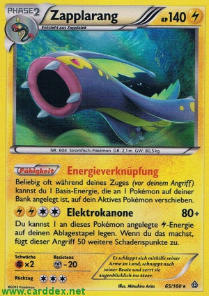 Kosten: Du kannst 1 an dieses Pokémon angelegte -Energie auf deinen Ablagestapel legen. Wenn du das machst, fügt dieser Angriff 50 weitere Schadenspunkte zu.  Schaden: