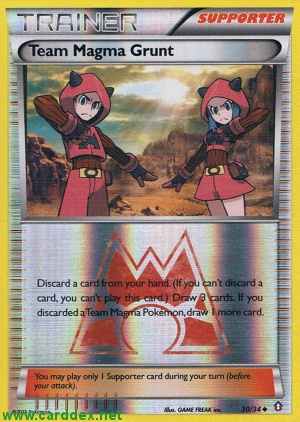 Discard a card from your hand. (If you can't discard a card, you can't play this card.) Draw 3 cards. If you discarded a Team Magma Pokémon, draw 1 more card.