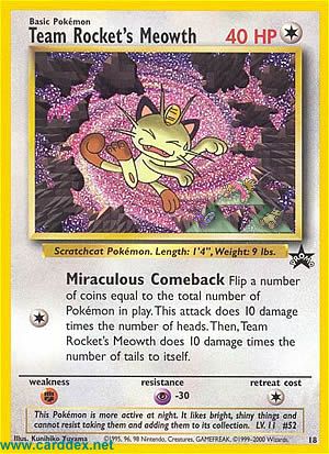 Kosten: Flip a number of coins equal to the total number of Pokemon in play. This attack does 10 damage times the number of heads. Then, Team Rocket's Meowth does 10 damage times the number of tails to itself.  Schaden: