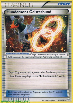 Dein Zug endet nicht, wenn das Pokémon, an das diese Karte angelegt ist, zu M-Hundemon-EX wird.