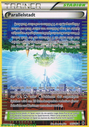 Entscheide dich vor dem Spielen dieser Karte, auf welchen Spieler „↓“ zeigen soll. Schaden durch Angriffe der -, -, oder -Pokémon des angezeigten Spielers wird um 20 Schadenspunkte reduziert (bevor Schwäche und Resistenz verrechnet werden). |