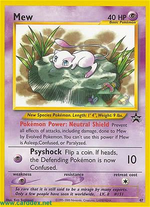 Prevent all effects of attackes, including damage, done to mew by Evolved Pokemon. You can't use this power if Mew is Asleep, Confused or Paralyzed.