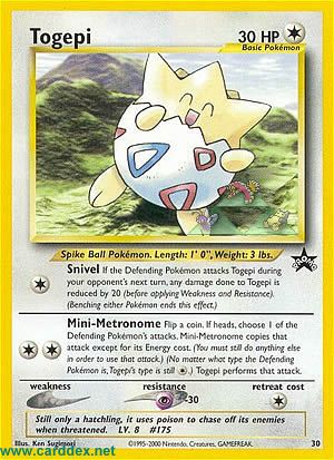 If the defending Pokemon attacks Togepi during your opponent's next turn, any damage done to Togepi is reduced by 20 (before apply Weakness and Resistence). (Benching either Pokemon ends this effect.)
