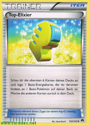 Beschreibung: Schau dir die obersten 6 Karten deines Decks an und lege 1 Basis-Energiekarte, die du darunter findest, an 1 Basis-Pokémon auf deiner Bank an. Mische die anderen Karten zurück in dein Deck.