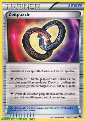 Du kannst 2 Zeitpuzzle-Karten auf einmal spielen. ◆ Wenn du 1 Karte gespielt hast, schau dir die obersten 3 Karten deines Decks an und lege sie in beliebiger Reihenfolge zurück auf dein Deck. ◆ Wenn du 2 Karten gespielt hast, nimm 2 Karten von deinem Ablagestapel auf deine Hand.