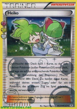 Beschreibung: Durchsuche dein Deck nach 1 Karte, zu der sich 1 deiner Pokémon (außer Pokémon-EX) entwickelt, und lege sie auf das entsprechende Pokémon. (Dies zählt als Entwicklung des Pokémon.) Mische anschließend dein Deck. Du kannst diese Karte während deines ersten Zuges oder für ein Pokémon, das in diesem Zug ins Spiel gebracht wurde, verwenden.