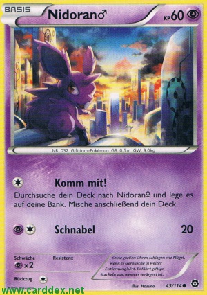 Kosten: Durchsuche dein Deck nach Nidoran♀ und lege es auf deine Bank. Mische anschließend dein Deck.   Schaden:
