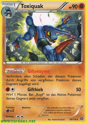 Kosten: Wirf 1 Münze. Bei „Kopf“ ist das Aktive Pokémon deines Gegners jetzt vergiftet.   Schaden: