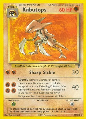 Kosten: Entferne von Kabutops Schadensmarke in Höhe der Hlftedes Schadens (auf die nächsten 10 aufgerundet), der dem verteidigenden Pokemon zugefügt wurde (nachdem Schwäche und Resistenz abgerechnet wurden). Falls Kabutops weniger Schadensmarken at, erntferne sie alle.  Schaden: