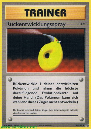 Beschreibung: Rückentwickle 1 deiner entwickelten Pokémon und nimm die höchste daraufliegende Evolutionskarte auf deine Hand. (Das Pokémon kann sich während dieses Zuges nicht entwickeln.)