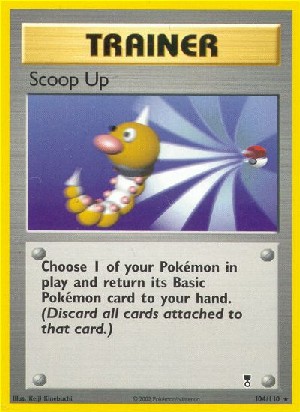 Wähle eines Deiner Pokemon im Spiel und nimm seine Basis-Karte auf Deine Hand zurück (Entferne alle auf dieser Karte abgelegte Karten.)