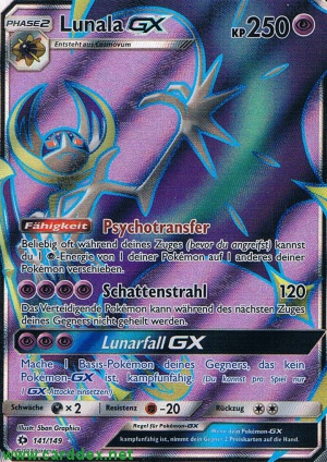 Kosten: Mache 1 Basis-Pokémon deines Gegners, das kein Pokémon-GX ist, kampfunfähig. (Du kannst pro Spiel nur 1 GX-Attacke einsetzen.)   Schaden:
