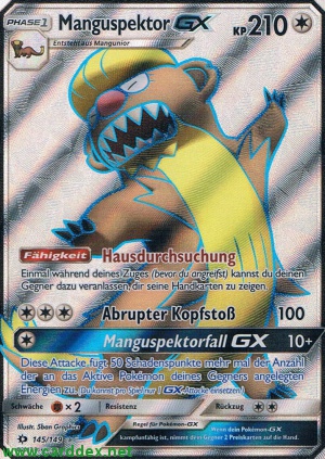 Kosten: Diese Attacke fügt 50 Schadenspunkte mehr mal der Anzahl der an das Aktive Pokémon deines Gegners angelegten Energien zu. (Du kannst pro Spiel nur 1 GX-Attacke einsetzen.)   Schaden: