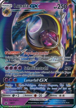 Kosten: Mache 1 Basis-Pokémon deines Gegners, das kein Pokémon-GX ist, kampfunfähig. (Du kannst pro Spiel nur 1 GX-Attacke einsetzen.)   Schaden: