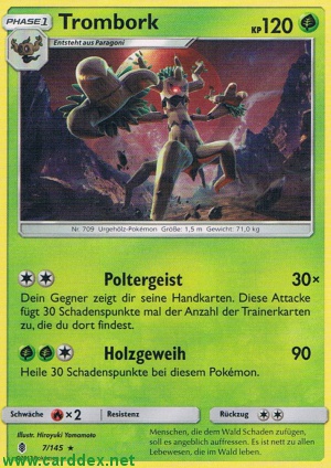 Kosten: Dein Gegner zeigt dir seine Handkarten. Diese Attacke fügt 30 Schadenspunkte mal der Anzahl der Trainerkarten zu, die du dort findest.   Schaden: