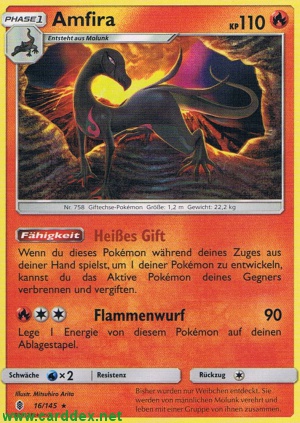 Wenn du dieses Pokémon während deines Zuges aus deiner Hand spielst, um 1 deines Pokémon zu entwickeln, kannst du das Aktive Pokémon deines Gegners verbrennen und vergiften.
