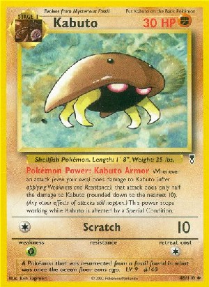 Immer wenn ein Angriff (auch dein eigener) Kabuto Schaden zufügt (nachdem Schwäche und resistenz abgrechnet wurden), fügt dieser Angriff Kabuto nur die hälfte des Schadens (auf die nächsten 10 aufgerundet) zu. (Alle anderen Auswirkungen von Angriffen finden immer noch statt.) Diese Fähigkeit verliert ihre Wirkung, solange Kabuto schläft, verwirrt oder gelähmt ist.