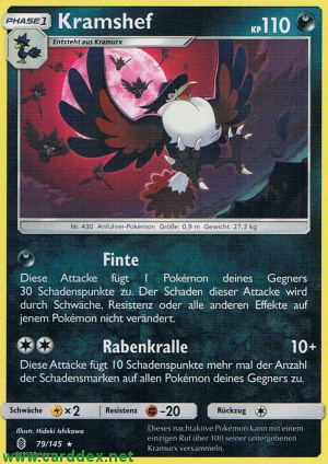 Kosten: Diese Attacke fügt 1 Pokémon deines Gegners 30 Schadenspunkte zu. Der Schaden dieser Attacke wird durch Schwäche, Resistenz oder alle anderen Effekte auf jenem Pokémon nicht verändert.   Schaden:
