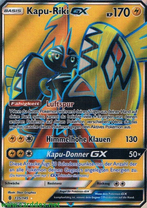 Kosten: Diese Attacke fügt 50 Schadenspunkte mal der Anzahl der an alle Pokémon deines Gegners angelegten Energien zu. (Du kannst pro Spiel nur 1 GX-Attacke einsetzen.)   Schaden: