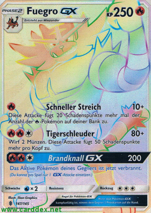 Kosten: Das Aktive Pokémon deines Gegners ist jetzt verbrannt. (Du kannst pro Spiel nur 1 GX-Attacke einsetzen.)   Schaden: