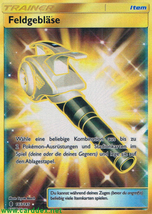 Beschreibung: Wähle eine beliebige Kombination aus bis zu 2 Pokémon-Ausrüstungen und Stadionkarten im Spiel (deine oder die deines Gegners) und lege sie auf den Ablagestapel.