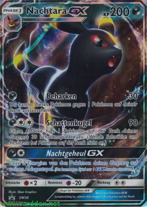Kosten: Lege 2 Energien von den Pokémon deines Gegners auf seinen Ablagestapel. (Du kannst pro Spiel nur 1 GX-Attacke einsetzen.)   Schaden: