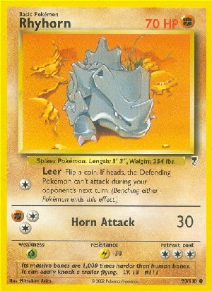 Kosten: Wirf eine Münze. Bei 'Kopf' kann das verteidigende Pokemon Rihorn während des nächsten gegnerischen Zuges nicht angreifen. (Kommt einer der beiden Pokemon auf der Bank, ist diese Wirkung nicht weiter gültig.)  Schaden: