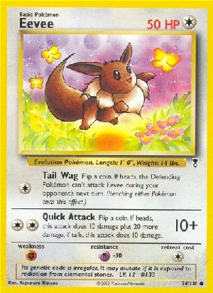 Kosten: Wirf eine Münze. Bei 'Kopf' kann das verteidigende Pokemon Evoli während des nächsten Zuges des gegners nicht angreifen. (Kommt einer der beiden Pokemon auf die Bank, ist diese Wirkung nicht weiter gültig.)  Schaden: