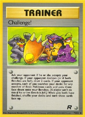 Beschreibung: Ask you opponent if he or she accepts your challenge. If your opponent declines (or if both Benched are full), draw 2 cards. if your opponent accepts, each of you searches your decks for any number of basic Pokemon cards and puts them face down onto your Benches. (A player can't do this if his or her Bench is full.) When you both have finished, shuffle your decks and turn thos card face up.