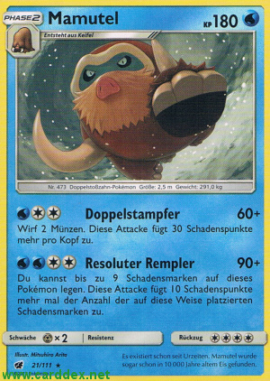 Du kannst bis zu 9 Schadensmarken auf dieses Pokémon legen. Diese Attacke fügt 10 Schadenspunkte mehr mal der Anzahl der auf diese Weise platzierten Schadensmarken zu.