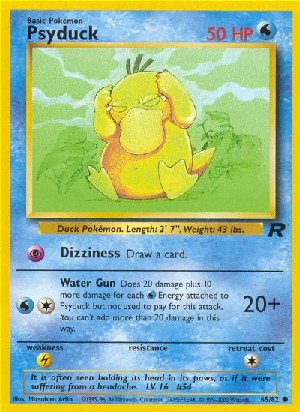 Kosten: Does 20 damage plus 10 more damage for each Energy attached to Psyduck but not used to pay for this attack. You can't add more than 20 damage in this way.  Schaden:
