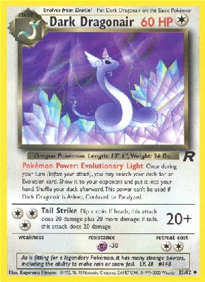 Once during your turn (before your attack), you may search your deck for an Evolution card. Shwo it to your opponent and put it into your hand. Shuffle your deck afterward. This power can't be used if Dark Dragonair is Asleep, Confused, or Paralyzed.