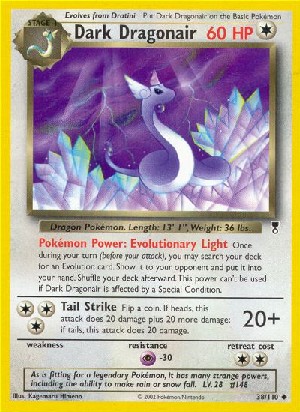 Once during your turn (before your attack), you may search your deck for an Evolution card. Shwo it to your opponent and put it into your hand. Shuffle your deck afterward. This power can't be used if Dark Dragonair is Asleep, Confused, or Paralyzed.