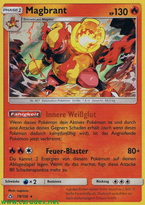 Wenn dieses Pokémon dein Aktives Pokémon ist und durch eine Attacke deines Gegners Schaden erhält (auch wenn dieses Pokémon dadurch kampfunfähig wird), ist das Angreifende Pokémon jetzt verbrannt.