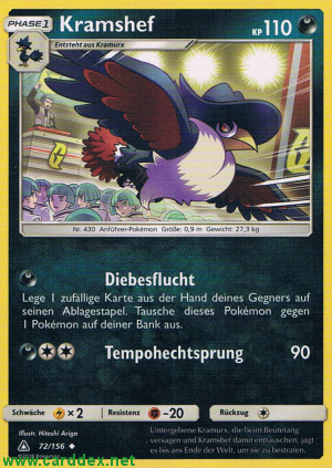 Kosten: Lege 1 zufällige Karte aus der Hand deines Gegners auf seinen Ablagestapel. Tausche dieses Pokémon gegen 1 Pokémon auf deiner Bank aus.  Schaden: