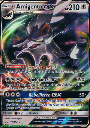 Kosten: Diese Attacke fügt 50 Schadenspunkte mal der Anzahl der Pokémon auf der Bank deines Gegners zu. (Du kannst pro Spiel nur 1 GX-Attacke einsetzen.)  Schaden: