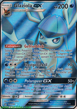Solang dieses Pokémon dein Aktives Pokémon ist, haben die Pokémon-GX und Pokémon-EX deines Gegners im Spiel, auf seiner Hand und in seinem Ablagestapel keine Fähigkeiten, außer Gefrierblick.