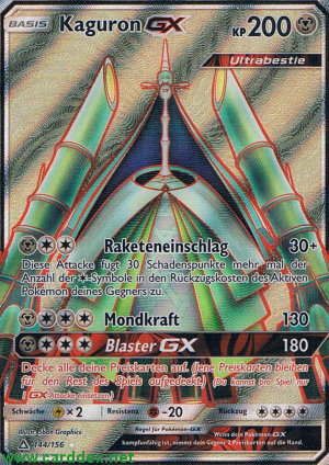 Kosten: Decke all deine Preiskarten auf. (Jene Preiskarten bleiben für den Rest des Spiels aufgedeckt.) (Du kannst pro Spiel nur 1 GX-Attacke einsetzen.)  Schaden: