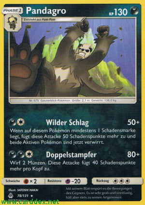 Kosten: Wenn auf diesem Pokémon mindestens 1 Schadensmarke liegt, fügt diese Attacke 50 Schadenspunkte mehr zu und beide Aktiven Pokémon sind jetzt verwirrt.  Schaden: